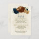 Beautiful earth tone fall wedding reception details enclosure card featuring terracotta, beige and navy blue flowers with green leaves .