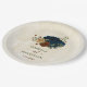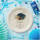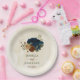 Beautiful earth tone fall paper plate featuring terracotta, beige and navy blue flowers with green leaves .