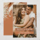 Elegant boho wedding save the date cards featuring a photo of the bride & groom, monocromatic earth tone boxes with a editable text template. On the reverse is a terracotta background with watercolor desert dried palm leaves, and trendy pampas grass.