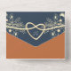 Elegant, modern, navy blue and terracotta all-in-one wedding invitation with gold rope heart, gilded floral lace and custom four pictures of the couple.