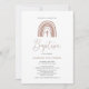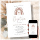 Customizable baptism invitation featuring a terracotta rainbow on a white background.