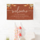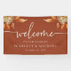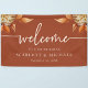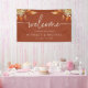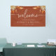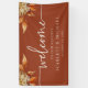 Terracotta Welcome Wedding Banner. Make a bold statement at your celebration with this eye-catching banner. It is beautifully illustrated with watercolor fall foliage in terracotta, burnt orange, and copper hues paired with soft beige dahlias and rust-coloured roses. Set on a rich copper background, this banner brings warmth and unity to your décor. Perfect for entryways, dessert tables, or photo backdrops, personalize your banner for a seamless fall wedding look.