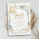 An elegant terrarium geometric gold frame border Sweet 16 invitation featuring a gold layered design of geometric frames and gold butterflies (digital effects) with blue eucalyptus foliage, as well as modern calligraphy on a modern ivory background. Elegant and chic, it is the perfect invitation for an elegant celebration with a touch of whimsical, or a backyard garden bridal lunch, brunch or party for a teen who loves boho and butterflies.