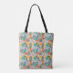 This tote bag has a mid-century modern design of triangles making a terrazzo floor look, in greys, turquoise, orange, gold, and green.