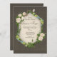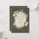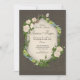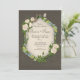 Cette faire-part de mariage est ornée d'un arrière - plan terreux foncé, à l'atmosphère douce et rustique. Au centre se trouve une belle fenêtre blanche voûtée, encadrée de verdure luxuriante, de délicates roses blanches et de lichens. Le texte est élégamment placé à l'intérieur de l'arche, invitant les invités à rejoindre le couple pour célébrer leur mariage. Les noms du couple sont écrits dans un script gracieux, tandis que le reste du texte est dans une police serif claire, ce qui le rend facile à lire.