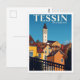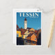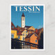 Capture the charm of Tessin (Ticino), Switzerland with this gorgeous vintage-style travel poster. The design showcases the region's characteristic colorful houses and a towering clock tower, set against a clear blue sky and distant mountains. The artwork evokes the sunny, Italian-Swiss charm of the canton. Perfect for travel lovers, fans of Swiss Alps scenery, collectors of retro illustration, or a unique souvenir to send from Europe.