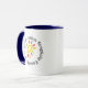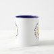 A Testimonial Mug with a sun in the centre with the words Justice, Simplicity, Equality, Unity, Peace are written in a circle around George Fox.