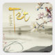Lovely and bucolic scene with cherry blossom bird as background + yellow Happy + golden Têt. Design on square sticker. Matching greeting card, postcard, invitation and more.... Perfect for a romantic and timeless Vietnamese New Year and for Year of the Ox 2021.