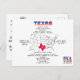 Texas. The state of the United States of America. Marked red on the USA map. Useful info about the capital, the largest city, the time zone, as well as about the highest and the lowest points. The number of the population, state's name before statehood and the date of admission to Union, nickname, motto and the state's song. Word Texas is decorated with the American flag of blue, white and red colours. Customizable text 50 STATES and the image-text USA at the bottom right corner on the front and on the back. Customizable template text on the back. You can change or delete template texts and you can use your own logo instead of the USA image. This is a postcard for anyone. You can transfer this design to another product of your choice, just use an option to the right of this description. Enjoy and be happy!
