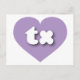This postcard features a lavender heart containing the bold, white, rounded lower case letters tx, a playful abbreviation for Texas, the lone star state. The reverse side of the postcard is blank, awaiting your personalized text or handwritten sentiments.