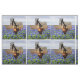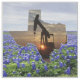 Pump jack pumping oil at sunset made into the shape of Texas on a background of bluebonnets and blue sky printed on fabric.