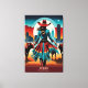 Embrace the spirit of the Texas frontier! This striking scene captures a confident woman in a cowboy outfit, flanked by majestic longhorns against a dramatic sunset and city skyline. Her vibrant red hat and fringed skirt embody the boldness and vibrancy of Texas culture. Celebrate adventure, tradition, and the heart of the Lone Star State!