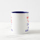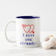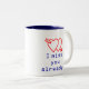 This is a blue, red and white ringer mug featuring the popular text 'I miss you already'. A great gift mug for someone you care about. The text is easily personalized to say anything you like easily. It also features two red hearts bound together with an arrow through it.