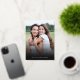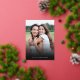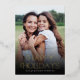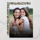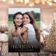 Ces cartes de vœux de vacances élégantes présentent un modèle de photo pleine page, une typographie moderne élégante qui lit "Joyeuses Fêtes" en feuille d'or véritable, et un motif floral dessiné à la main au dos dans des couleurs de Noël classiques de vert foncé, rouge bordeaux et ivoire sur un fond sable / beige. Facile à personnaliser pour de belles cartes de vacances qui épateront tous vos proches.