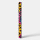 This vibrant image is a close-up of a painting featuring a swirling, wavy pattern of leopard print in various colours. The colours include blue, pink, turquoise, purple, yellow, and orange, all with black spots. The brushstrokes are thick and layered, giving the impression of a dynamic, moving texture.