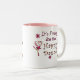 A pink flamengo dances the Happy Dance on both the front and back of this white mug.