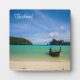 An exotic travel destination. Thailand in South East Asia. This travel photo features a pretty scenic tropical beach from Thailand. Crystal clear turquoise waters, soft sandy beach, bright blue sky and lush green trees in the background. A single fishing boat sits on the beach ready to go fishing for the day. Scenic, tranquil and still this nature image evokes a sense of timeless calm.