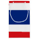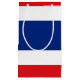 The flag of the Kingdom of Thailand shows five horizontal stripes in the colours red, white, blue, white and red, with the central blue stripe being twice as wide as each of the other four.