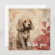 A golden brown puppy with fluffy fur is sitting quaintly next to a couple of large, stylized roses. The background features abstract beige tones with subtle floral outlines and script-like markings, giving a soft, vintage feel to the whole composition.