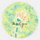 These pretty Thank you stickers feature an abstract floral, flower, painting that is orange, white, and green. The flower looks to be made of connecting geometric shapes. The background is a textured look of aqua, blue, and yellow. The text, Thank you, can be customized on the template form. By CherylsArt on Zazzle.