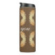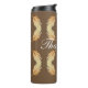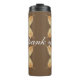 This thermal tumbler features a unique feather pattern in deep, rich, autumn colours. The feathers display colours of yellow and light brown against a dark brown background. The curve words "thank you" appear in the centre of this graphic design and can be customized to suit your needs.