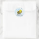 Round sticker for baby shower favour with bee design and blue colour background with text