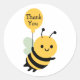 Adorable thank you sticker featuring a cute yellow and black cartoon bee sticker. The bee is holding a yellow balloon with the words thank you inside. Ideal for showing gratitude in the cutest way.