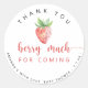 Cute baby shower invitation card featuring watercolor illustration of strawberries. The text says "berry much for coming" Matching items available.