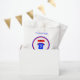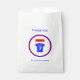 A fun and colourful 7th birthday party favour bag ready for your customized text. The circular design features a large red birthday banner with the message "HAPPY BIRTHDAY". Underneath, is a blue and red sports top, with a large white number 7 and space for the birthday child's name. Additional editable text in blue, top and bottom on the bag, reads "THANK YOU" "for coming to my party".