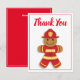 A flat thank you card for firefighters. The card shows a gingerbread firefighter in a red helmet and uniform. The back of the card has customizable text, where you can add your message.