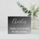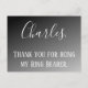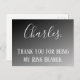The little guy did such a great job as your ring bearer, show him how much you appreciate him with this Ring Bearer thank you postcard. Displayed on a black ombre background, his name is written in large white cursive letters. Underneath is "Thank You for being my Ring Bearer" written in white standard font. Purchase your postcard today!