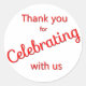 The Thank You for Celebrating with Us Sticker in red is perfect to add to thank you note envelopes, favour bags and more. Great for showers, weddings, parties, special occasions and other celebrations. This design looks better on the round or square stickers. Be sure to check out the matching stickers with the same text in black, pink, dark blue, and turquoise.