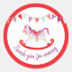 Baby Shower thank you stickers in colours of purple and red. Perfect for baby shower parties the thank your guests. Other matching items are available. Rocking horse watercolor painting by and design by Sarah Trett for www.mylittleeden.com