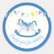 Boy Baby Shower thank you stickers in colours of blue and yellow. Perfect for baby shower parties the thank your guests. Other matching items available. Rocking horse watercolor painting by and design by Sarah Trett for www.mylittleeden.com