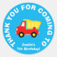Personalized Thank you for coming Birthday party favour stickers. Funny red toy dumptruck vehicle design for little men. Construction theme thank you labels with customizable background colour. ie soft yellow, grey, purple, light blue or girly pastel pink. Suitable for boys and girls. Adorable typography design with dump truck for Birthday thank you favours. Also handy as baby shower envelope seals / sealers to say thanks for coming or thank you for sharing our special day!