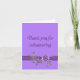 A thank you card in purple, featuring a lavender background with a darker ribbon across the bottom. The ribbon is decorated with a faux jewel in a silver setting and two sprays of purple flowers. You can edit the inside text as desired.