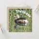 This unique appreciation card features a cute little grebe floating on the calm water. This animal's fluffy back feathers stand out against the smooth water surface. Green grasses and reeds as well as the adorable bird are reflected in the water in this nature photo. "Thank You" is featured above the small bird and is curved along the corner of this card. Customize easily if you desire.