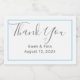 Wedding labels for mini-sparkling wine bottles with minimalist design. Grey text in larger script for "thank you" and printed text for names and date. White with a single, thin line frame in blue around edge of sticker. Easily change the colour of the line in the "customize further" area.