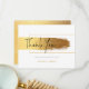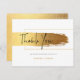 Elegant modern and simple wedding design featuring Thank you- black hand script typography on a gold single brushstroke.