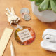 The background of this inexpensive teacher appreciation keychain features a swirled, yellow and orange, bright abstract pattern that is elegant and eye-catching. A solid light orange square is centered on this round keychain and provides the background for your words of appreciation. "Thank You For Being My Teacher" can easily be customized to suit your needs.