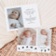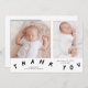 Whimsical birth announcement card featuring typography text that says "thank you" at the bottom with two photos on the font. You can add a 3rd picture on the back along with the birth stats and message. the background is white.