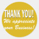 Thank you We appreciate your business in white on gold background available in button, sticker, or magnet. Have employees wear the button to thank your customers and let them know they are appreciated even if you are too busy to tell each person. Or use the sticker on your invoices or other special correspondence.