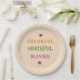 Thanksgiving party paper plates in whimsy typography "Thankful, Grateful, Blessed" with a fall leaves details.