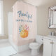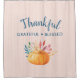 Shower curtain with typography text which says: Thankful grateful blessed. perfect for the thanksgiving season. An image of an orange watercolor pumpkin with autumn leaves and sprigs. Pink and gold striped pattern for the background.