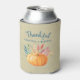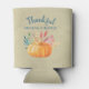 Can cooler with typography text which says: Thankful grateful blessed. perfect for the thanksgiving season. An image of an orange watercolor pumpkin with autumn leaves and sprigs.
