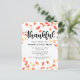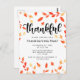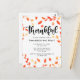 Elegant and modern style Thanksgiving party invitation postcard with text that says "Thankful" in hand lettering and calligraphy style font. Features watercolor style fall leaves foliage.
