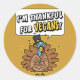This funny vegan Thanksgiving sticker features a cartoon turkey in a pilgrim hat saying, "I'm Thankful for Vegans." Also available on t-shirts, aprons, bags, apparel, and other gift ideas.