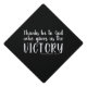 A modern graduation cap topper featuring the Bible verse 1 Corinthians 15:57 "Thanks be to God who gives us the victory" in white brush lettered style script font. Click "customize" to edit the background colour.