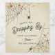 Spooky Halloween party favour design features blood-spattered spider webs at the corners, with hanging spider and the words "Thanks for Dropping By." Customize with a message and name beneath.