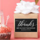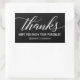 Thank you stickers feature modern white script "thanks" text and sleek custom text that can be personalized with a custom message and store name. Perfect to accent your sales. The black background colour can be customized.